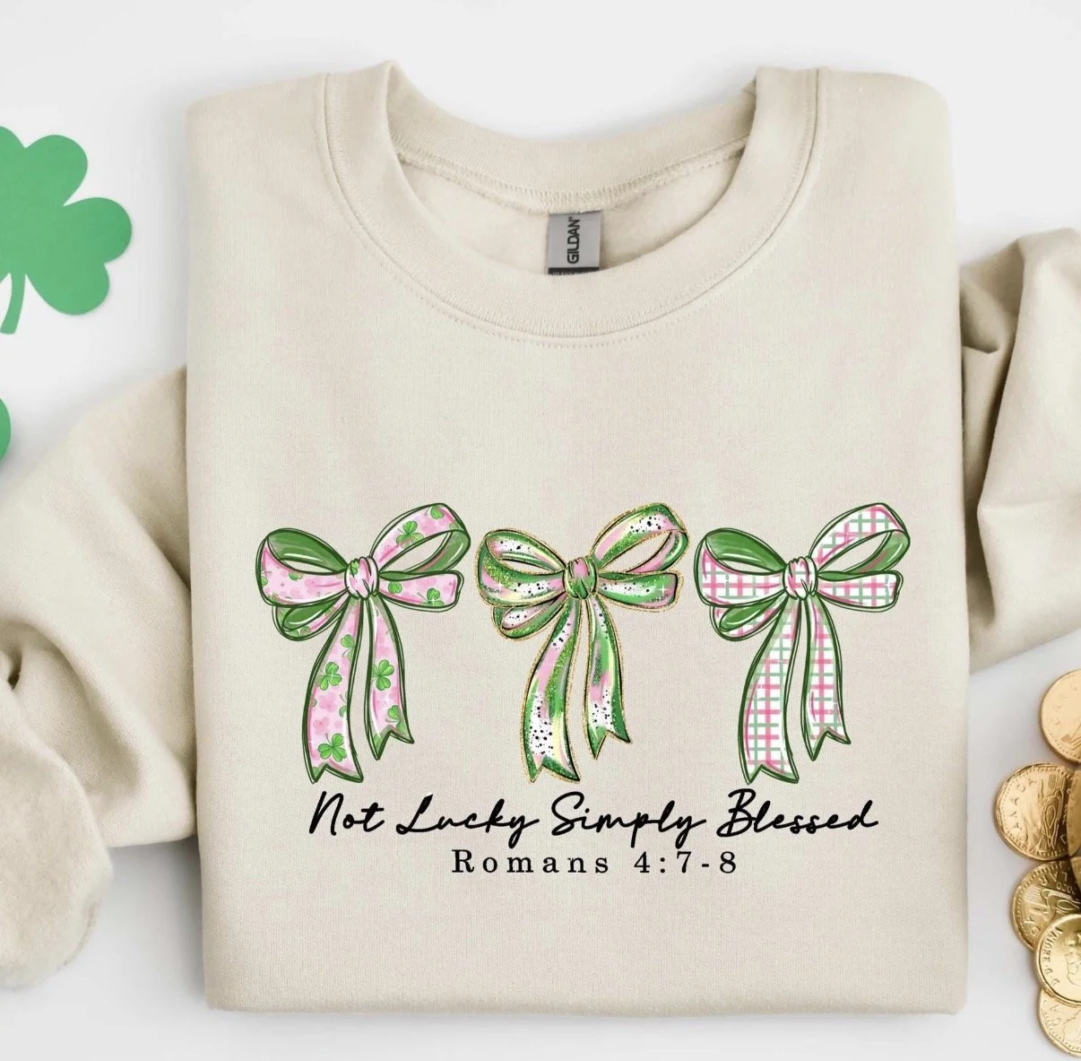 Embrace the season with a meaningful reminder that you aren't just lucky—you are truly blessed. Our Not Lucky Simply Blessed Sweatshirt combines the festive spirit of St. Patrick’s Day with the trendy coquette aesthetic, featuring three beautifully detailed ribbons in pink, green glitter, and classic plaid patterns.