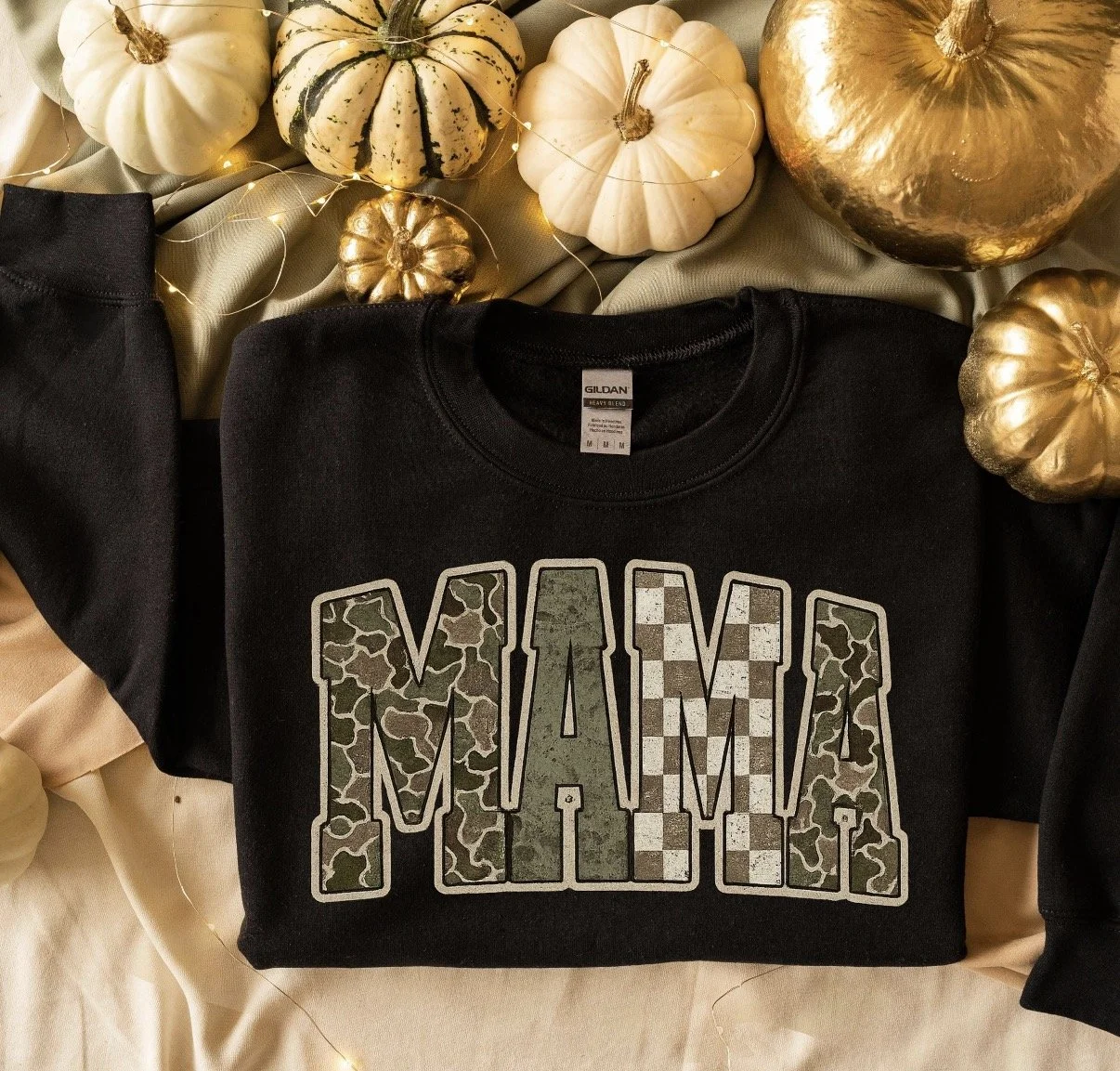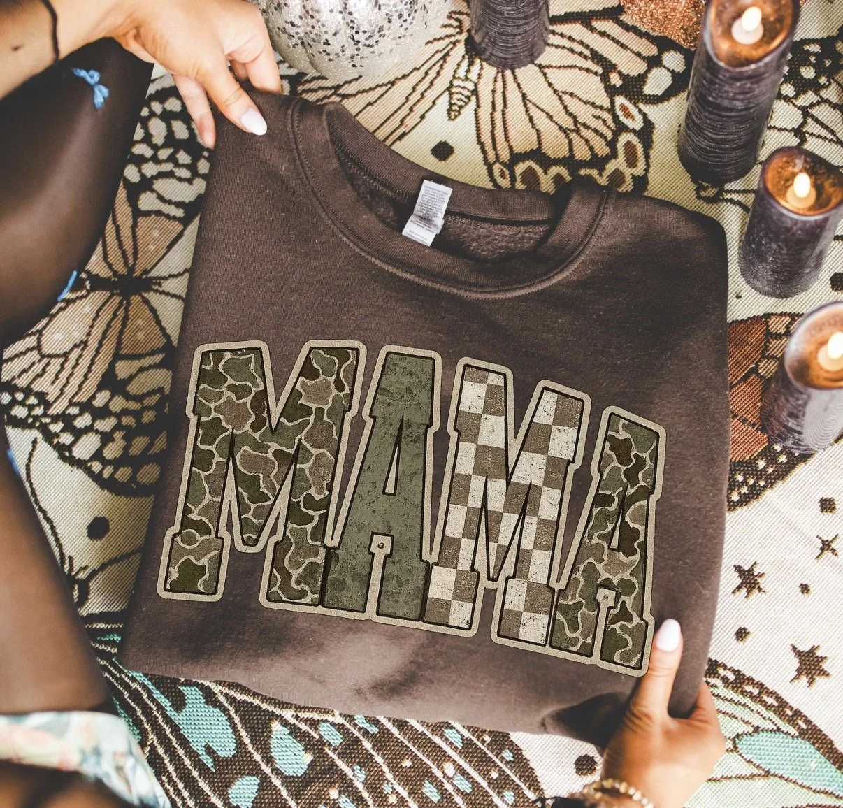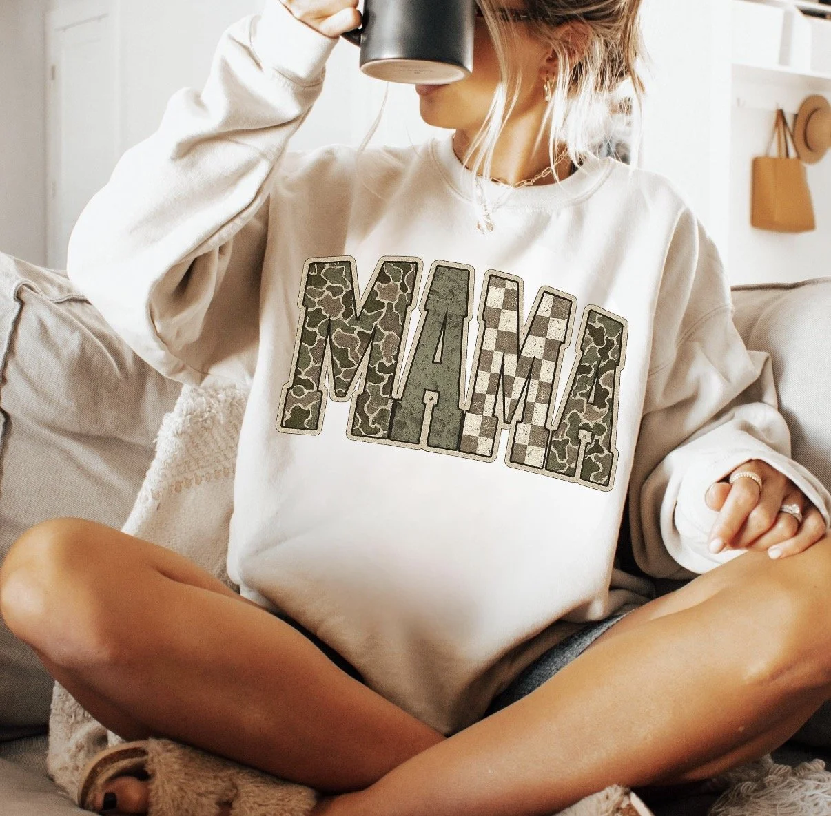 Elevate your everyday "mom uniform" with our Camo and Checkered Mama Sweatshirt. This design features a unique, high-contrast mix of classic camouflage and trendy neutral checkered patterns inside a bold varsity-style arch. Whether you're running errands, heading to sports practice, or enjoying a slow morning with coffee, this pullover brings a modern, edgy vibe to your wardrobe.
