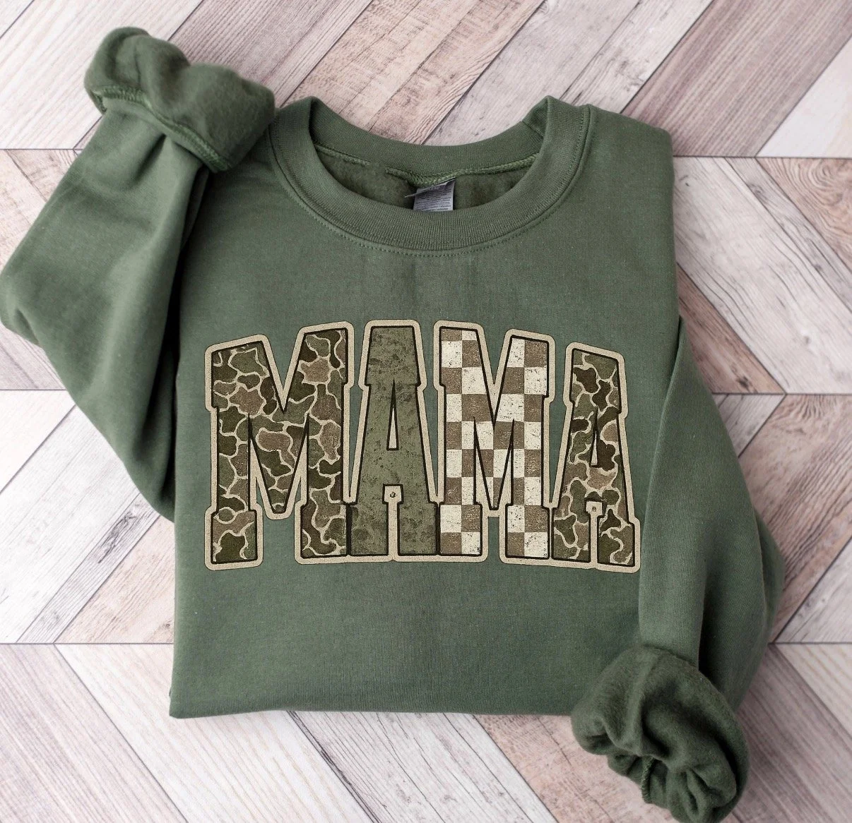 Camo and Checkered Mama Crewneck Sweatshirt - Custom Mixed Pattern Varsity Pullover